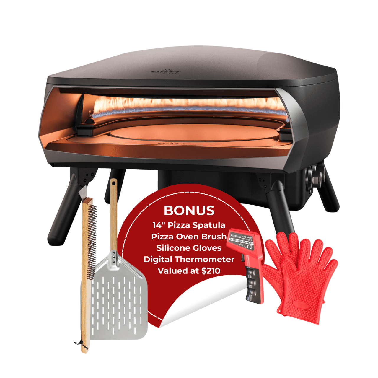 - The extra booster burner placed underneath the rotating pizza stone ensures a constant, even temperature and a consistent hot pizza stone to keep your pizzas coming in a continuous flow.